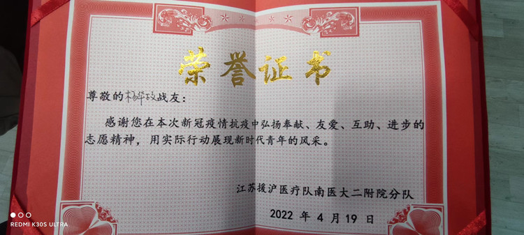 进入方舱医院后,杨华政感受到方舱医院条件的艰苦,看到志愿者们忙碌的身影,心中油然而生使命感,在自己健康状况稳定的情况下,杨华政立即萌发了做志愿者的想法,想为抗疫工作尽自己的绵薄之力。当他成功申请成为一名志愿者时,主要负责物资发放和确诊患者入院信息登记工作,忙碌而又繁琐,但从未叫苦叫累。经过三天的治疗,杨华政身体治愈恢复健康,出院时,因学生在志愿服务过程中表现优秀,方舱医院的医护人员为学生颁发荣誉证书,感谢他真挚的付出。