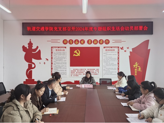 为深入学习贯彻习近平新时代中国特色社会主义思想和党的二十届三中全会精神,扎实推进党支部建设。3月13日中午,轨道交通学院党支部在博学楼SJ1305会议室召开2024年度专题组织生活会动员部署会。会议由党支部副书记夏霁雪主持,全体党员参加。