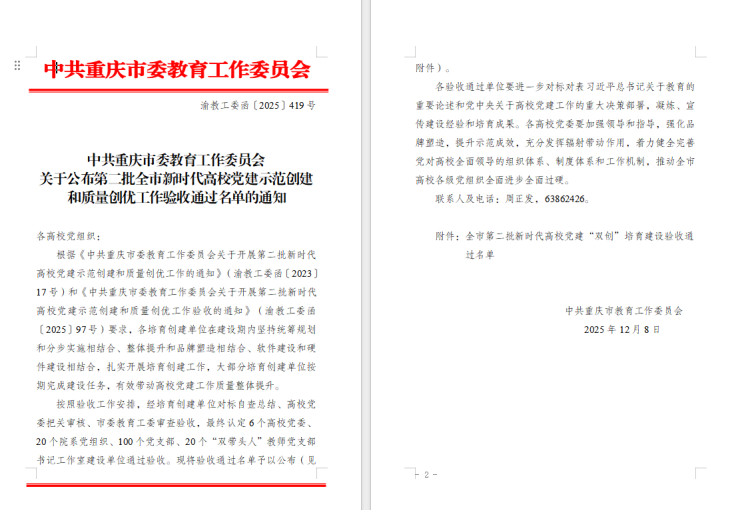 近日,中共重庆市委教育工作委员会公布了第二批全市新时代高校党建示范创建和质量创优工作验收结果,轨道交通学院党支部经历为期两年的培育创建,凭借扎实的工作成效、鲜明的建设特色顺利通过验收,正式获评“重庆市党建工作样板支部”。
